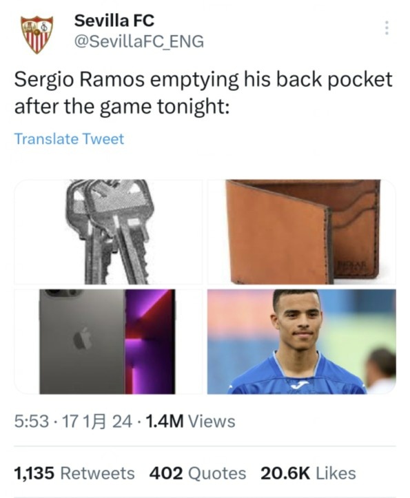 整活!塞维社媒:拉莫斯的屁股口袋里装着钥匙钱包手机和格林伍德