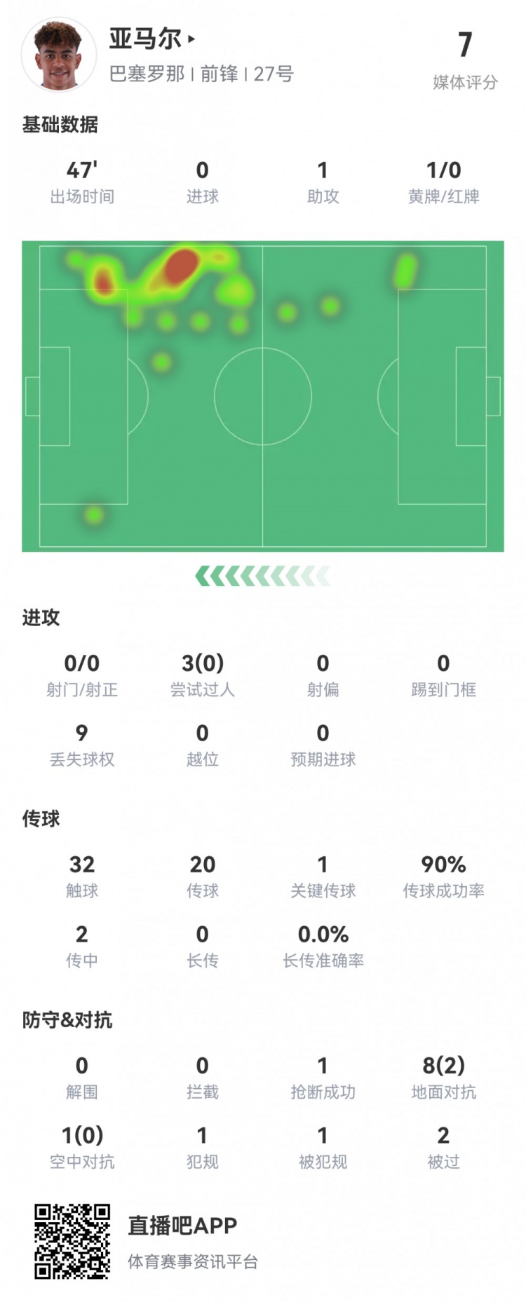 亚马尔半场数据:1助攻3过人0成功9对抗2成功评分7分