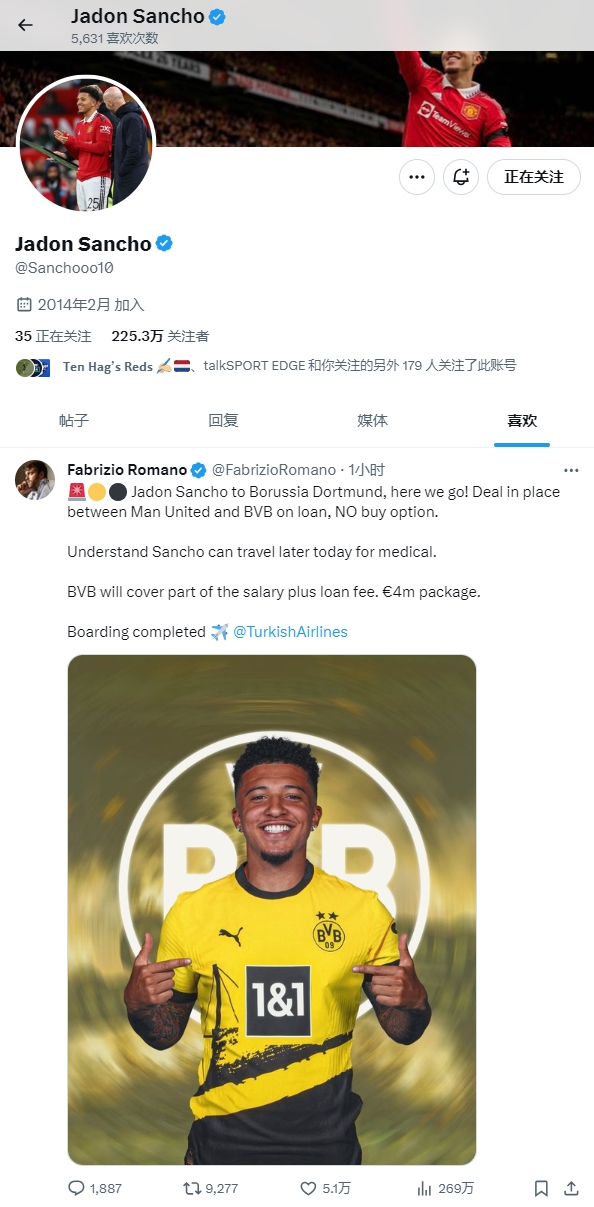 归心似箭!桑乔点赞了罗马诺HereWeGo,头像仍是与滕哈赫合照