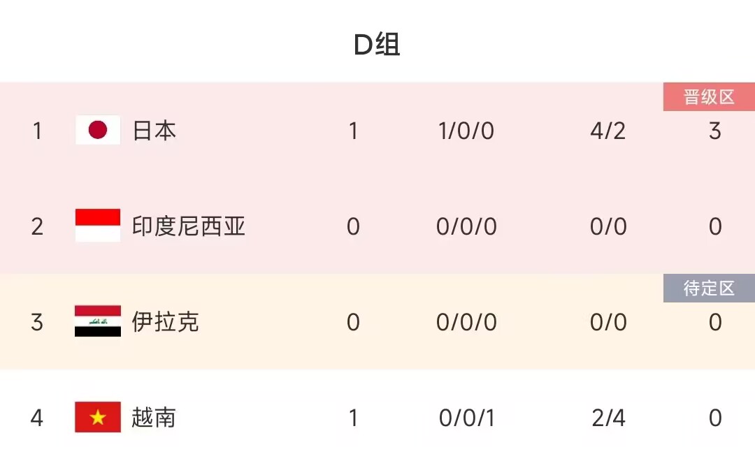 亚洲杯D组积分榜:日本战胜越南暂列第一,印尼伊拉克明日交锋