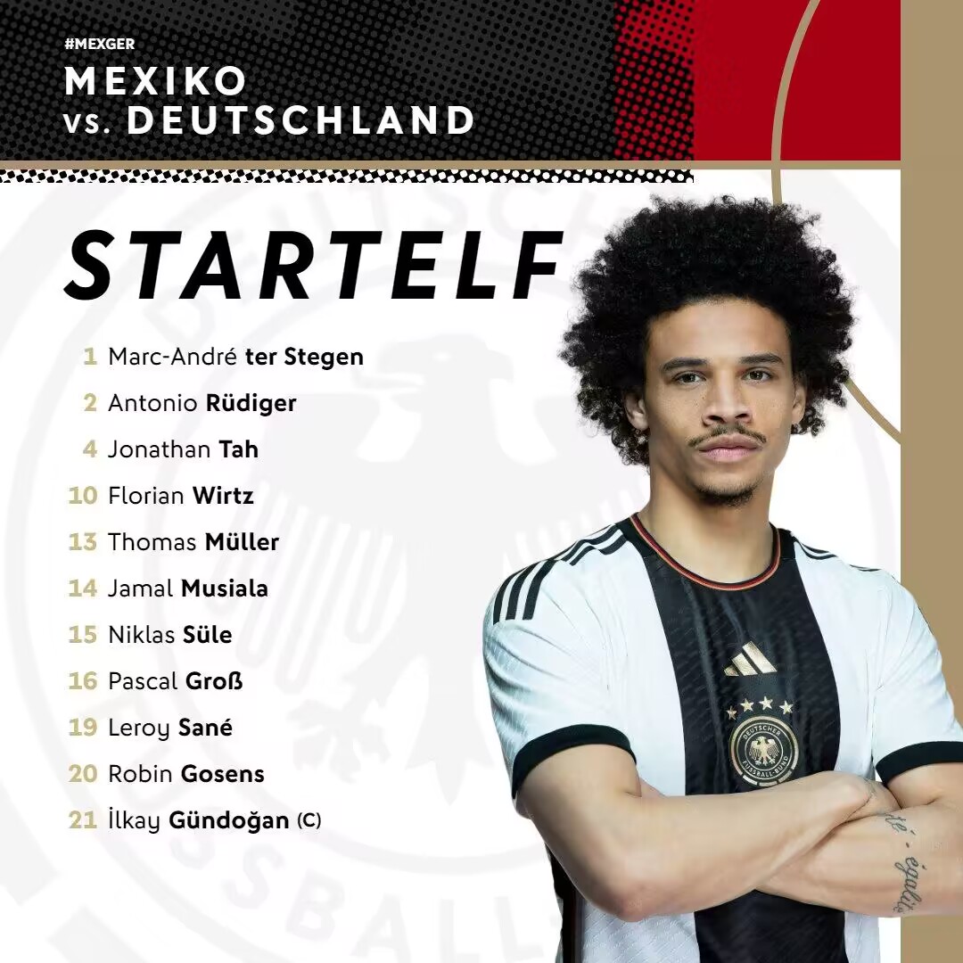 德国vs墨西哥首发:穆勒、萨内、穆西亚拉先发,京多安出战