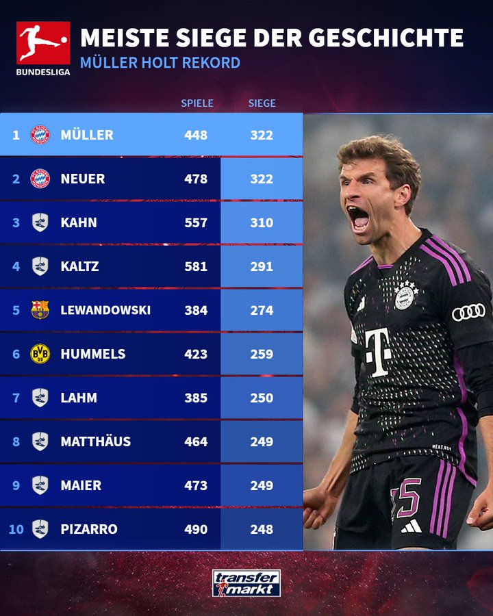 德甲传奇!穆勒拿到德甲第322场胜利,德甲胜场数追平诺伊尔