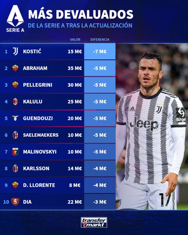意甲球员贬值榜:科斯蒂奇700万欧最多,卡卢卢、贡多齐500万欧
