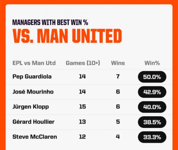 教练英超对阵曼联胜率榜:瓜帅50%居首,穆帅、克洛普二三位