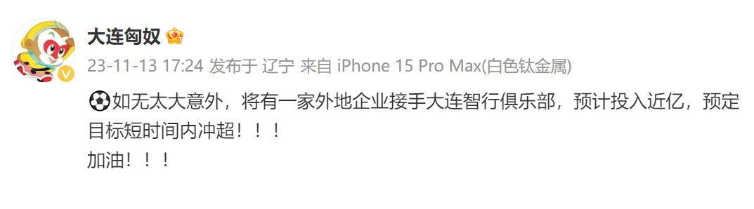 博主:一外地企业将接手大连智行,投入近亿目标短时间冲超
