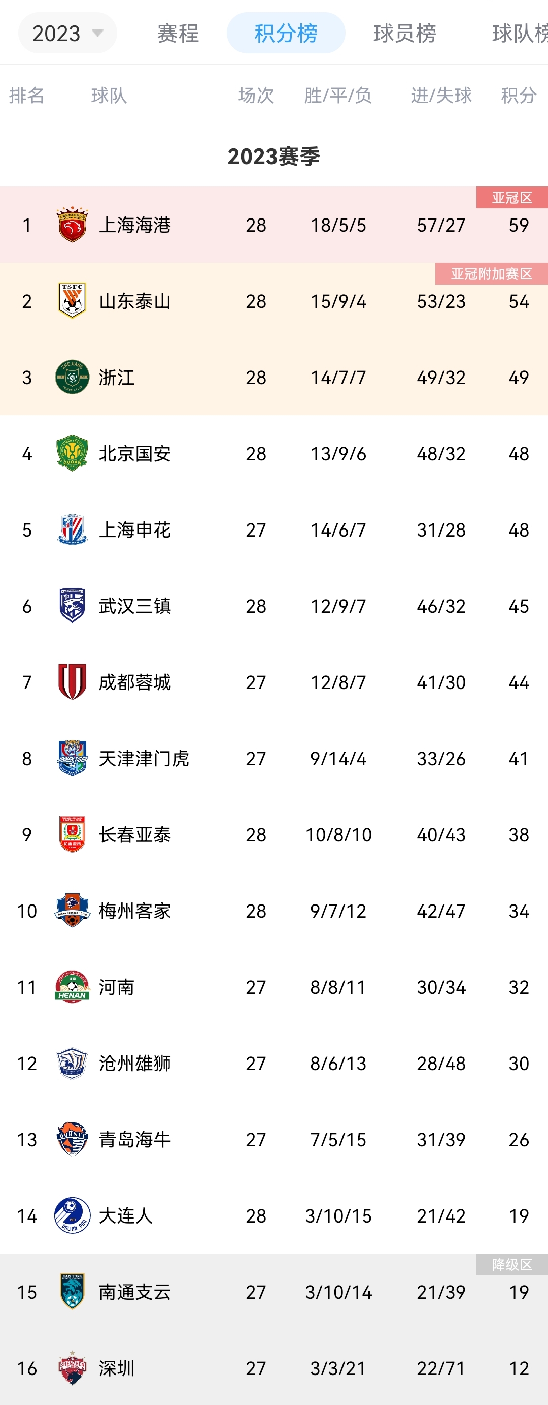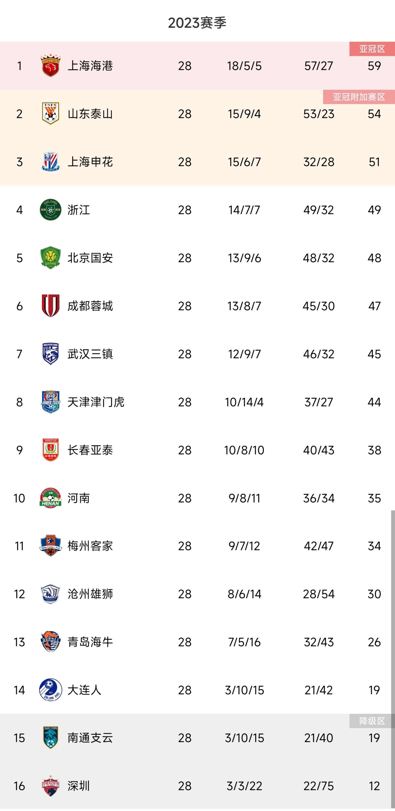 剩2轮中超积分榜:海港领先泰山5分领跑蓉城第6深圳提前降级
