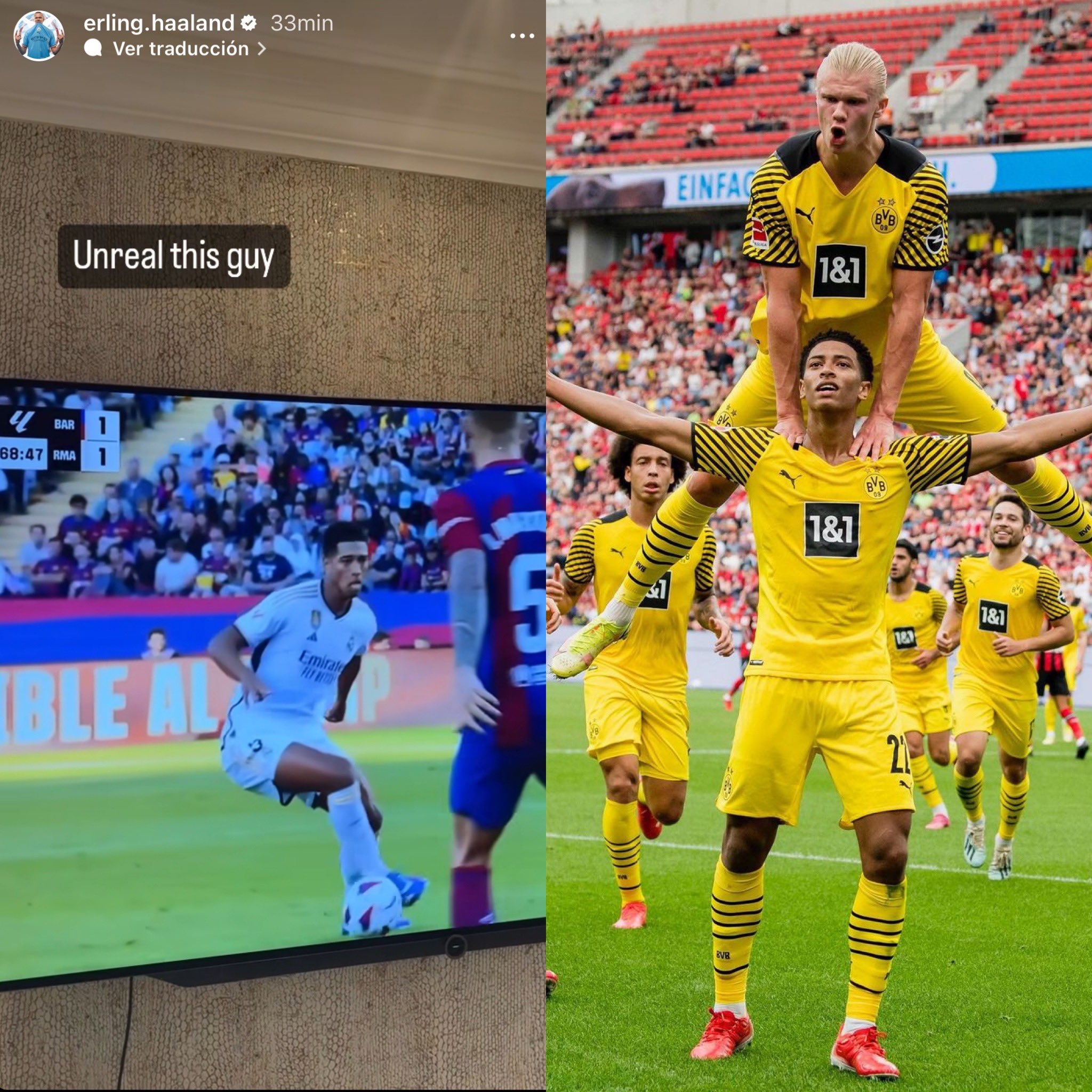 昨日哈兰德看国家德比狂赞老队友贝林厄姆,今日曼市德比上演2射1传