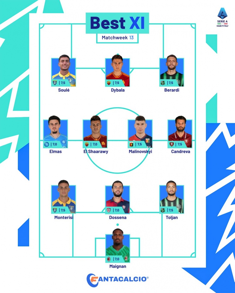 意甲第13轮最佳阵容:迪巴拉、迈尼昂、苏莱、沙拉维在列